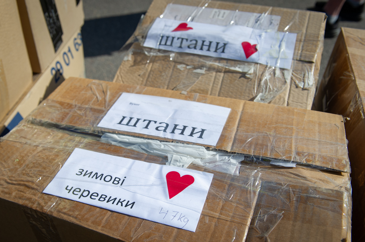 Skyddskläder i form av jackor, underställ och annat, packade av vår kollega Helen, med en liten hjärtlig hälsning.