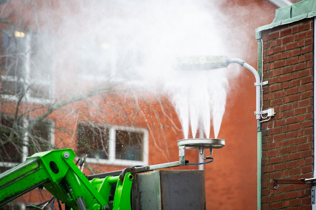 Vid ett tillfälle provtvättade vi armaturer i ett större område och räknade ut att vi lyckades rengöra 320 armaturer på cirka fyra timmar, inklusive körning till och från arbetsplatsen. Detta innebär att arbete utfördes 3–4 gånger snabbare än vid tvätt från liftkorg. Vi konstaterade också att det gick åt cirka 5 dl vatten per armatur.