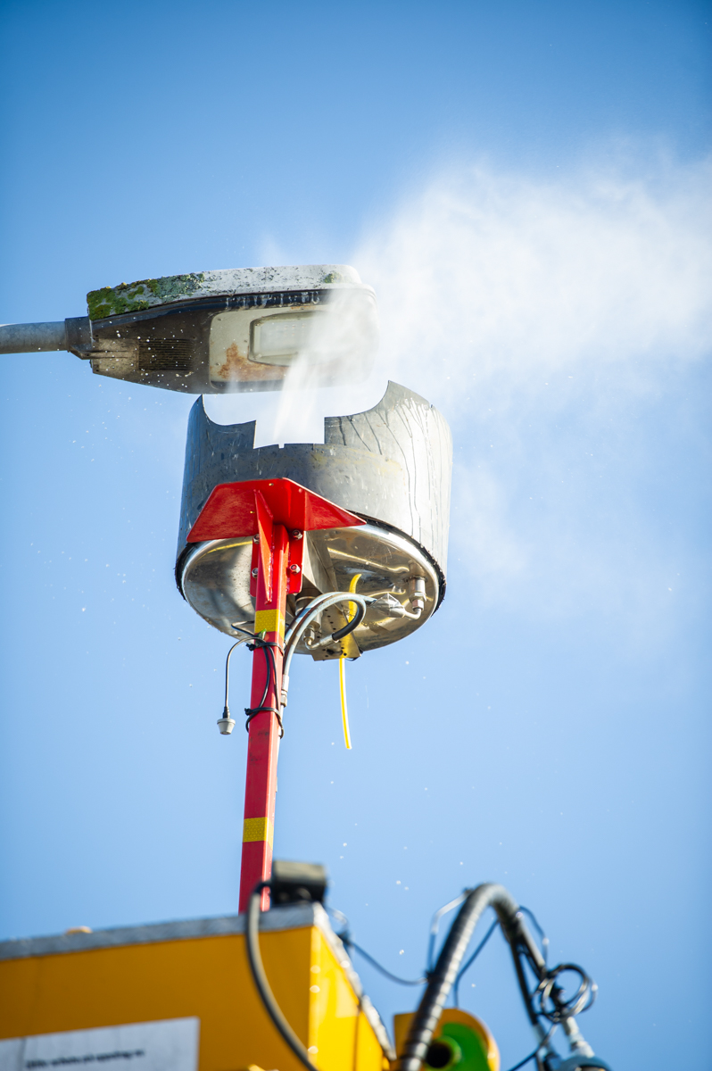 Tester genomfördes sedan med en luxmätare där vi mätte ljuset på vägbanan före och efter rengöring av armaturer, på kvällen/natten och under samma väderförhållanden. Testresultaten visade att ljusstyrkan på vägbanan ökade med 30–40 procent efter tvättning!