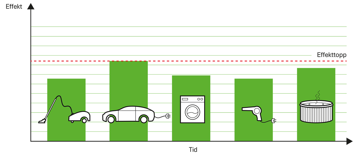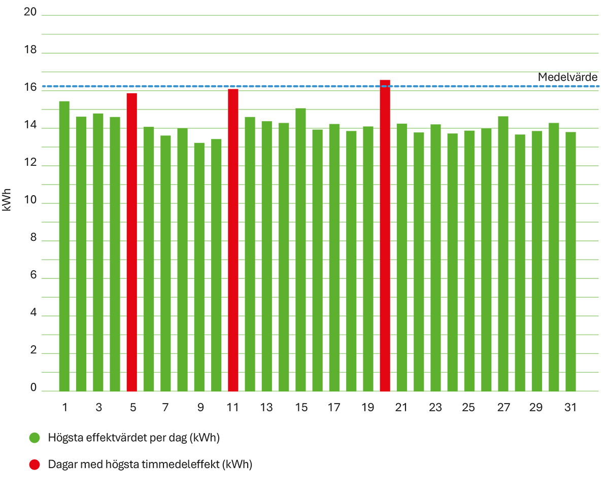 Genom att beräkna ett genomsnitt av de tre högsta effekttopparna under månaden får du möjlighet att påverka din elanvändning under hela månaden, i stället för att bara fokusera på en enskild dag eller timme.